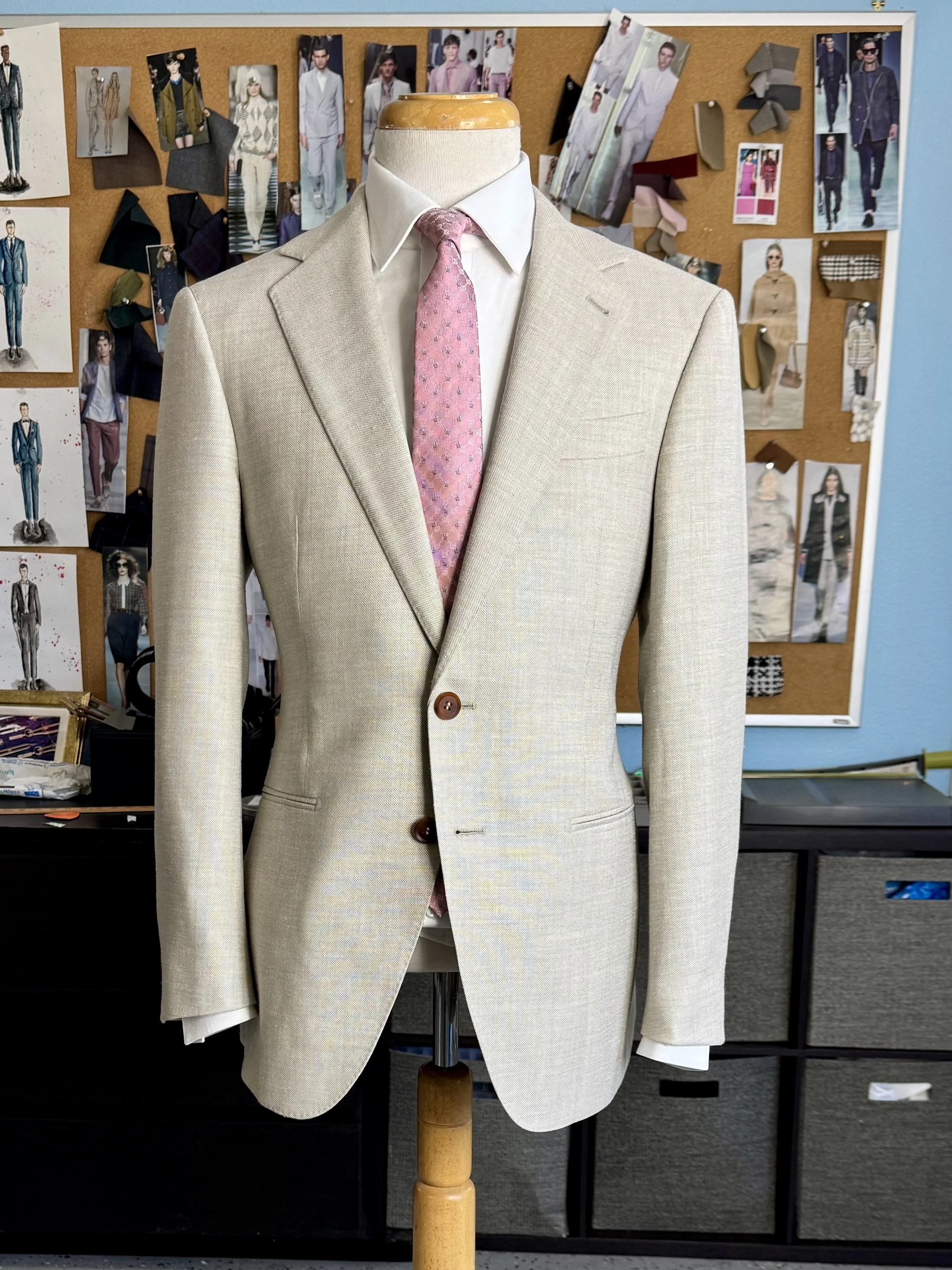 A full view of the sand linen and silk bespoke suit — lightweight Italian cloth, soft construction, and a tone made for light and warmth.