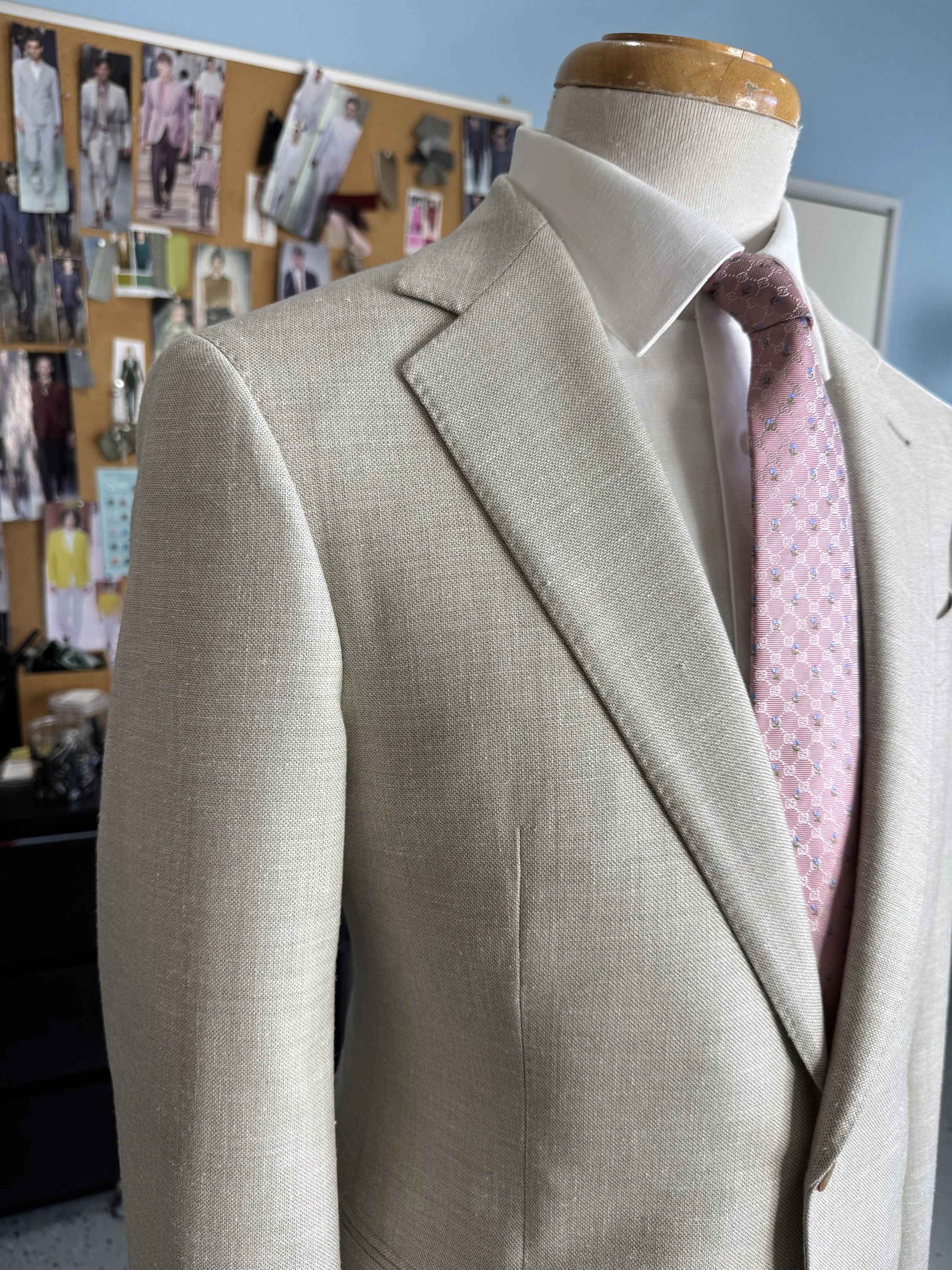 At Cutting Room Bespoke, we treat every commission as a dialogue — between client and cloth, between tailoring tradition and modern living. This sand linen and silk bespoke suit, like so many of our destination commissions, carries the spirit of bespoke beyond the atelier: light, adaptable, and deeply personal.
